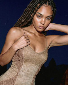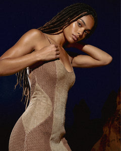 The Armor Dress is handcrafted and hand-dyed. Our coloring process is done with natural root dyes, which may cause the shade of the fabric to vary slightly from the one you see in the pictures, making every garment one of a kind.