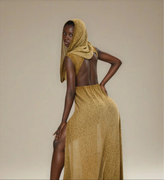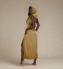 Unleash your inner warrior goddess with the Hera Hooded Dress. This striking piece features an open back and high side splits, blending elegance with bold femininity. The versatile hood transforms into a shawl, perfect for chilly nights, while the cotton and linen blend provides breathability and comfort. Hand-dyed with natural root dyes, every dress boasts unique shade variations, making each garment truly one of a kind.