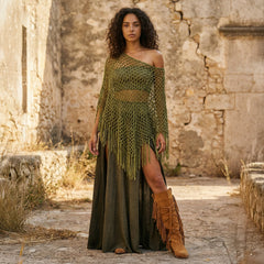 Handcrafted with an open crochet technique, the Unicorn Poncho drapes fluidly over the body, creating a light yet striking silhouette. Its airy structure allows skin to breathe beneath, while long hand-finished fringes add movement, rhythm, and a subtle sense of ritual with every step. The asymmetrical fall and relaxed neckline allow it to be worn off-shoulder or centered, adapting naturally to the wearer’s mood and form.