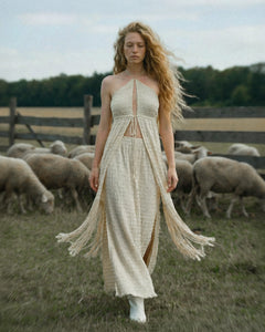 Step into boho elegance with the Zaria Fringe Top, made from specially handwoven cotton that feels as good as it looks. Designed with an open back and adjustable tie front, this top is perfect for any occasion, from casual outings to festivals. The long fringes at the bottom add a playful touch, making you feel like you're in a movie—ready to dance all the time! The natural elasticity of the fabric ensures comfort and flexibility, while the adjustable ties allow the top to fit perfectly for sizes XS to XL.